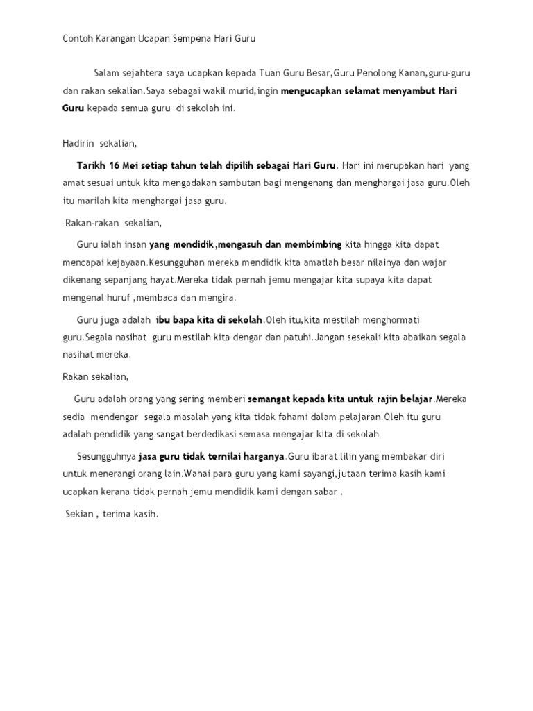 Sebagai ketua murid kamu diminta menyampaikan ucapan sempena sambutan hari guru di sekolah kamu. Selamat hari guru untuk semua guru hebat dimanapun kalian berada. Hari ini merupakan hari yang amat sesuai untuk kita mengadakan sambutan bagi mengenang dan menghargai jasa guru.oleh itu marilah kita menghargai jasa guru. Berikut contoh karangan ucapan sempena hari guru. Perlu diketahui, sejarah hari guru nasional berkaitan erat dengan persatuan guru republik indonesia (pgri) yang diawali oleh terbentuknya persatuan guru hindia belanda (pghb) pada tahun 1912.