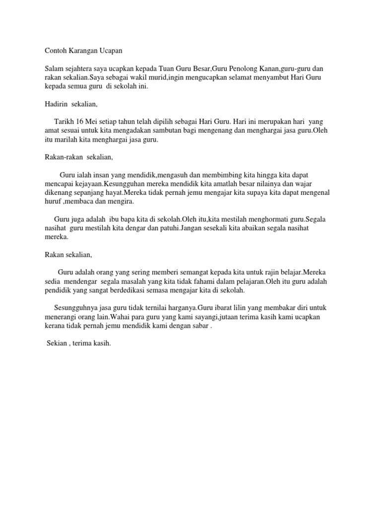 Laporan hari kokurikulum sekolah menengah kebangsaan seri murni. Guruku, terima kasih untuk segala komitmen dan dedikasi untuk mencerdaskan negeri. Berikut contoh karangan ucapan sempena hari guru. Panduan buat pelajar ujian pencapaian sekolah rendah (upsr). Berikut dikongsikan contoh karangan bahasa melayu berbentuk ucapan yang bertajuk ucapan hari guru.
